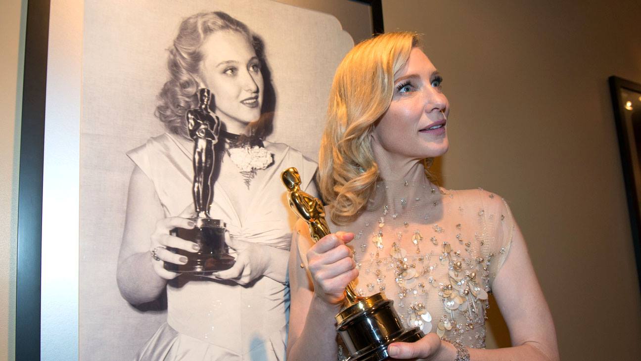 | Cate Blanchett holds on to her 2014 Best Actress trophy for “Blue Jasmine.” |