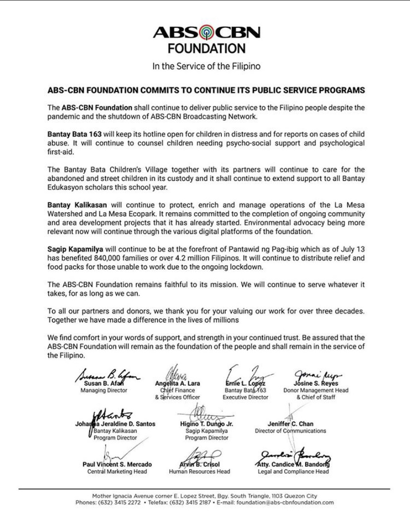 The management committee of ABS-CBN Foundation issued a statement of commitment on 16th July 2020 to continue its public service programs.