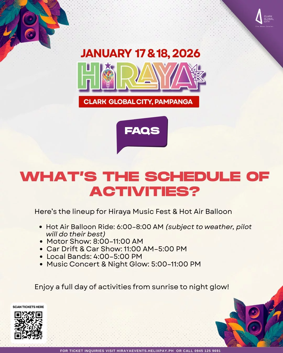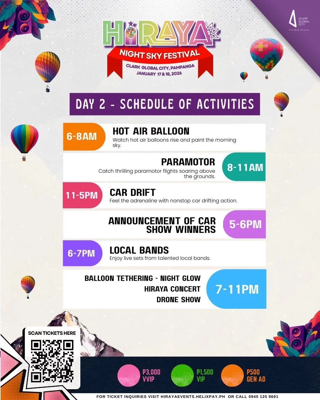 HIRAYA offers a full-day festival experience starting at 6:00 AM, featuring exhilarating activities such as hot air balloon rides, paramotor flights, and thrilling car drifting exhibitions. Festivalgoers can also explore interactive booths and experiential zones, rounded off by a thoughtfully curated food park. This exciting lineup transforms Clark Global City into a vibrant playground of sights and flavors.