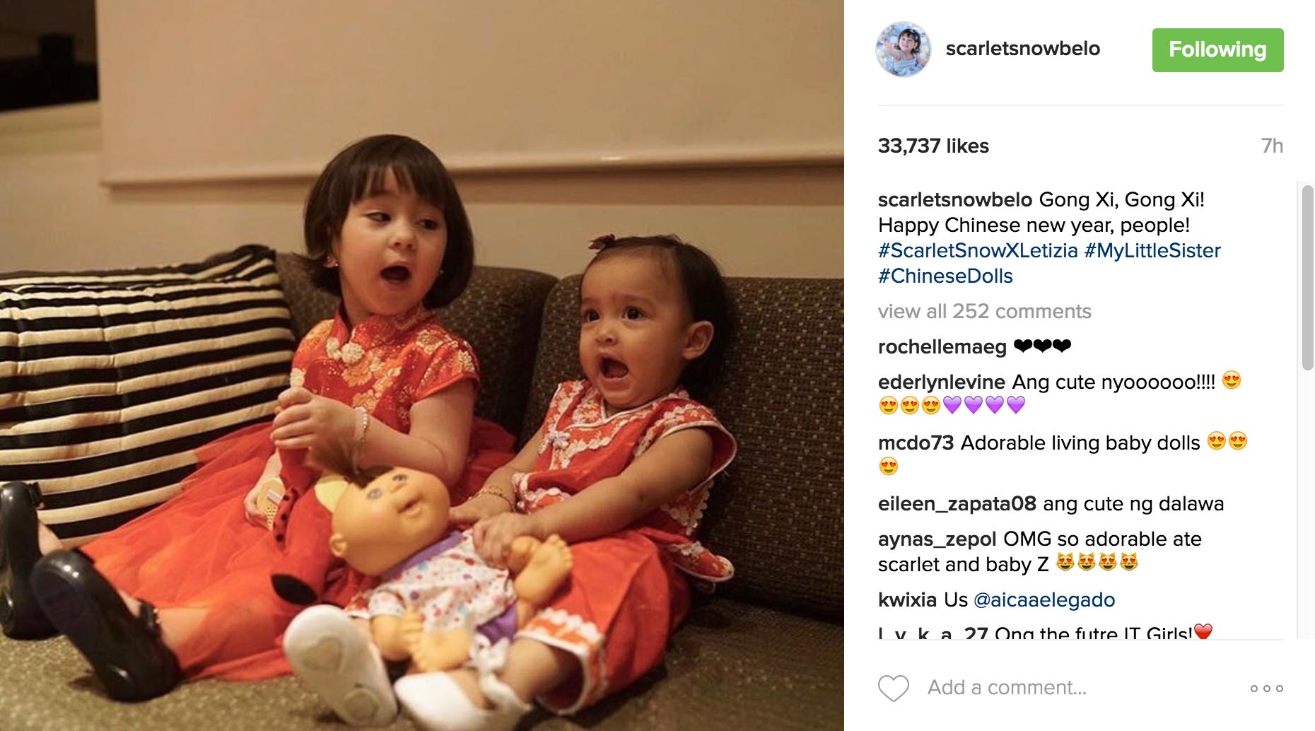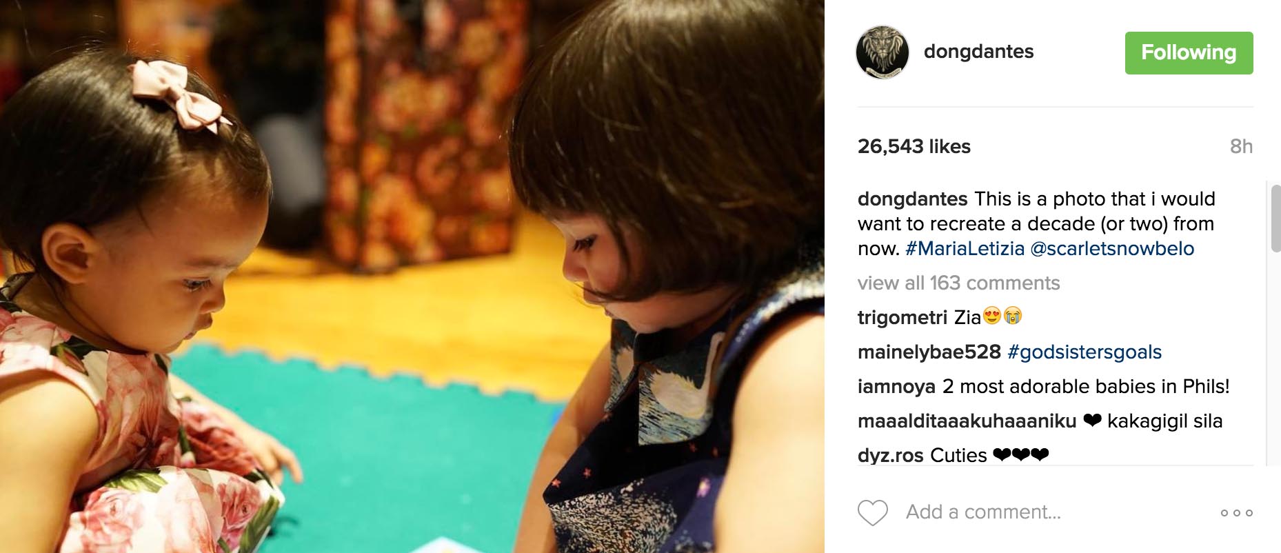 When two of the country’s most loved celebrity babies online got together for playtime, Instagram went on cuteness overload. Check out the photos of Scarlet Snow Belo, daughter of Drs. Hayden Kho and Vicki Belo, and Dingdong Dantes and Marian Rivera‘s Maria Letizia. Scarlet and Zia in single frames are just so adorable.