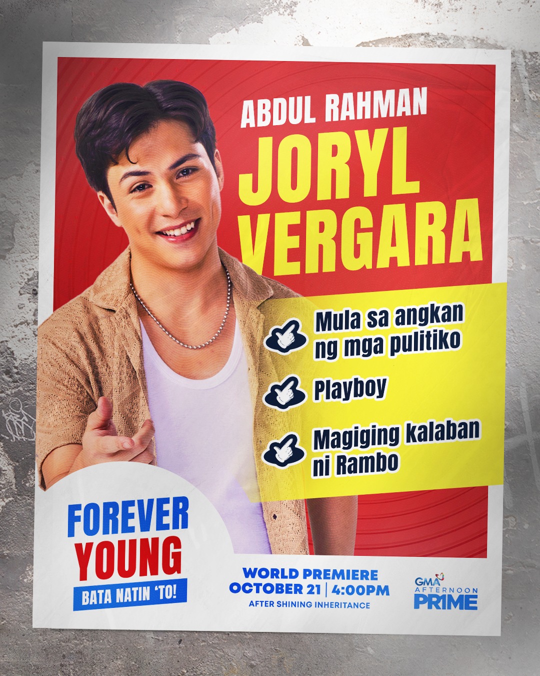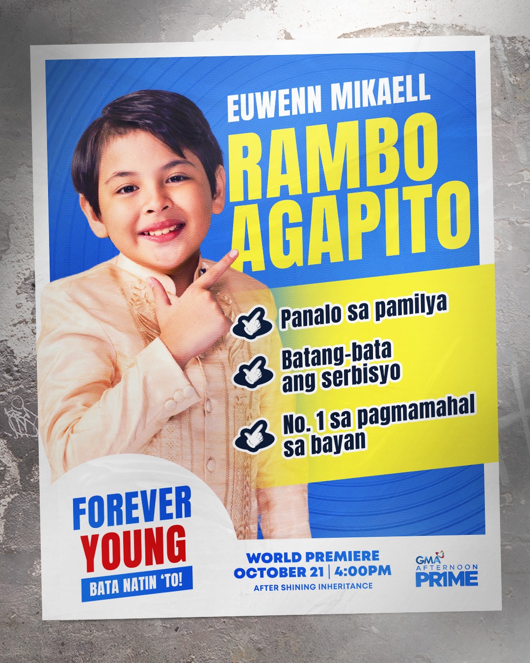 “Forever Young” tells the story of Rambo Agapito, a young man with a big heart and even bigger dreams, despite his small stature. Played by the country’s most-awarded child star, Euwenn Mikaell, Rambo is a 25-year-old man trapped in a 10-year-old’s body due to a rare condition called panhypopituitarism. Despite his physical limitations, Rambo aspires to serve the public and make a difference in the world.
