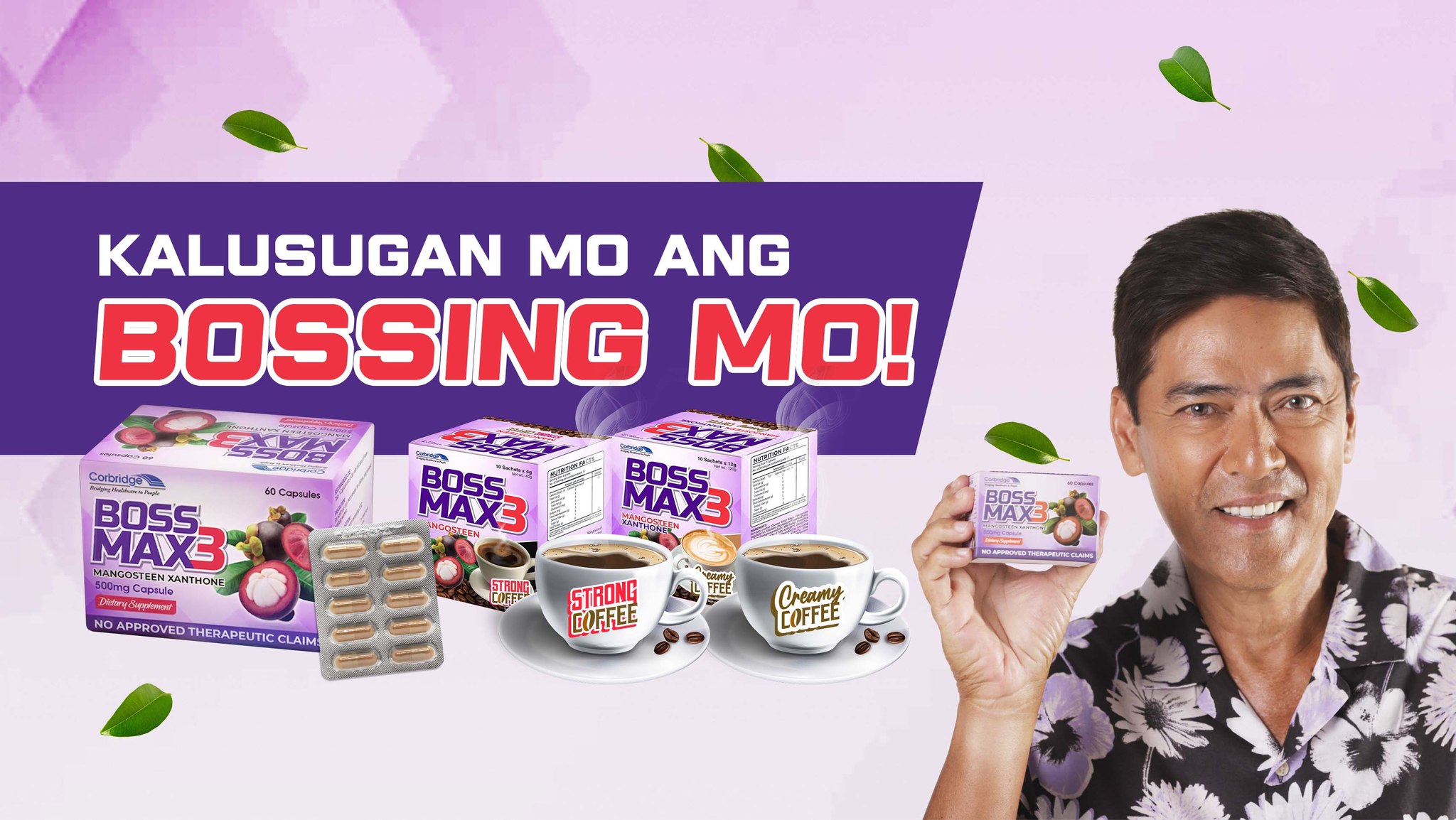 Championing the taglines “Kalusugan mo ang BOSSING mo” and “Kape ng mga SIKAT!”, BossMax3 is ready to prove and compete in the market of dietary supplement and coffee with its greatest weapon—the organically-produced Mangosteen Xanthone which helps improve health or overall wellness.
