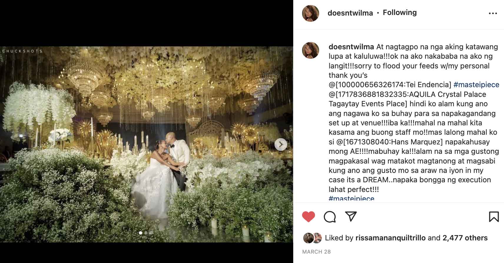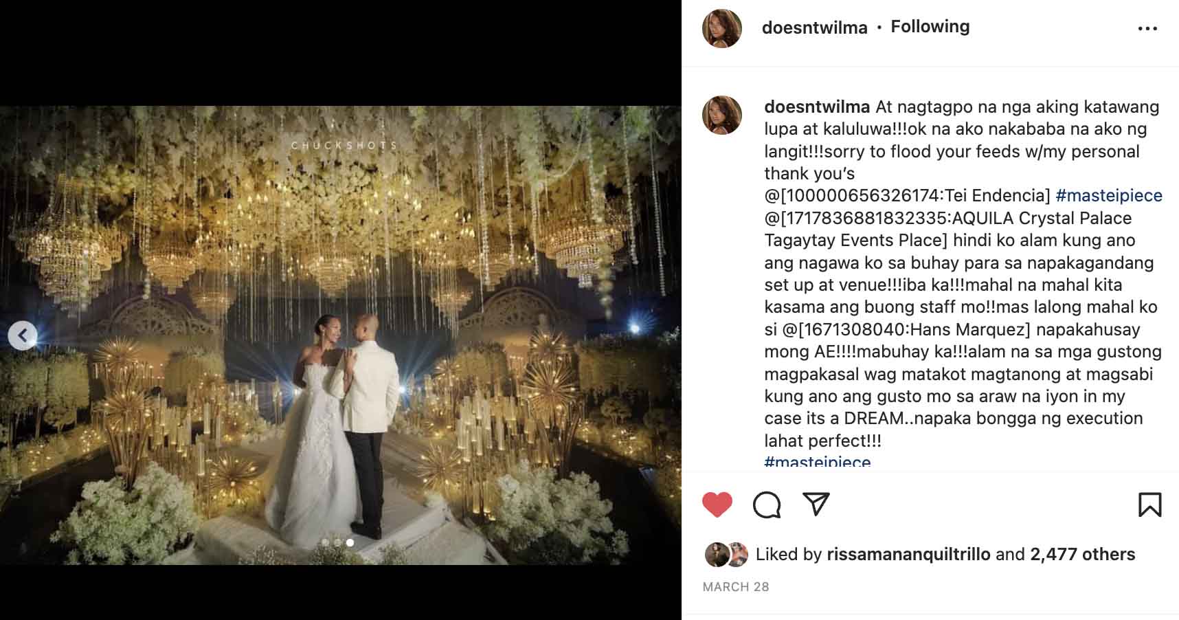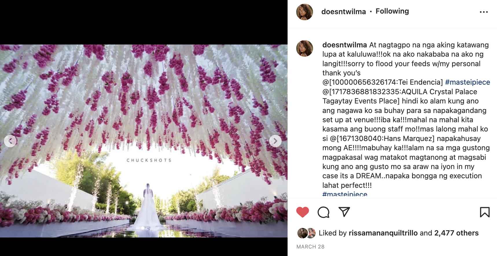 It is important to note that Tei was referring to actress Wilma Doesnt whose fabulous wedding venue styling he did. The actress couldn’t help but rave about it in an Instagram post: