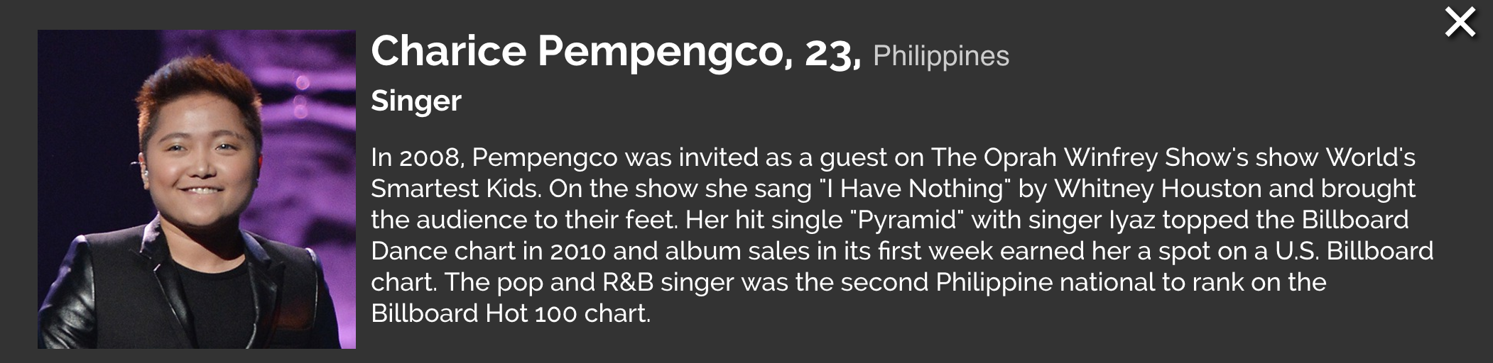 10 Filipinos made it to Forbes Magazine’s 30 under 30 Asia list. Included in the list is singer Charice Pempengco (23) which was honored for her contributions in music especially with her hit single, “Pyramid” (with singer Iyaz), which topped the Billboard Dance chart in 2010.
