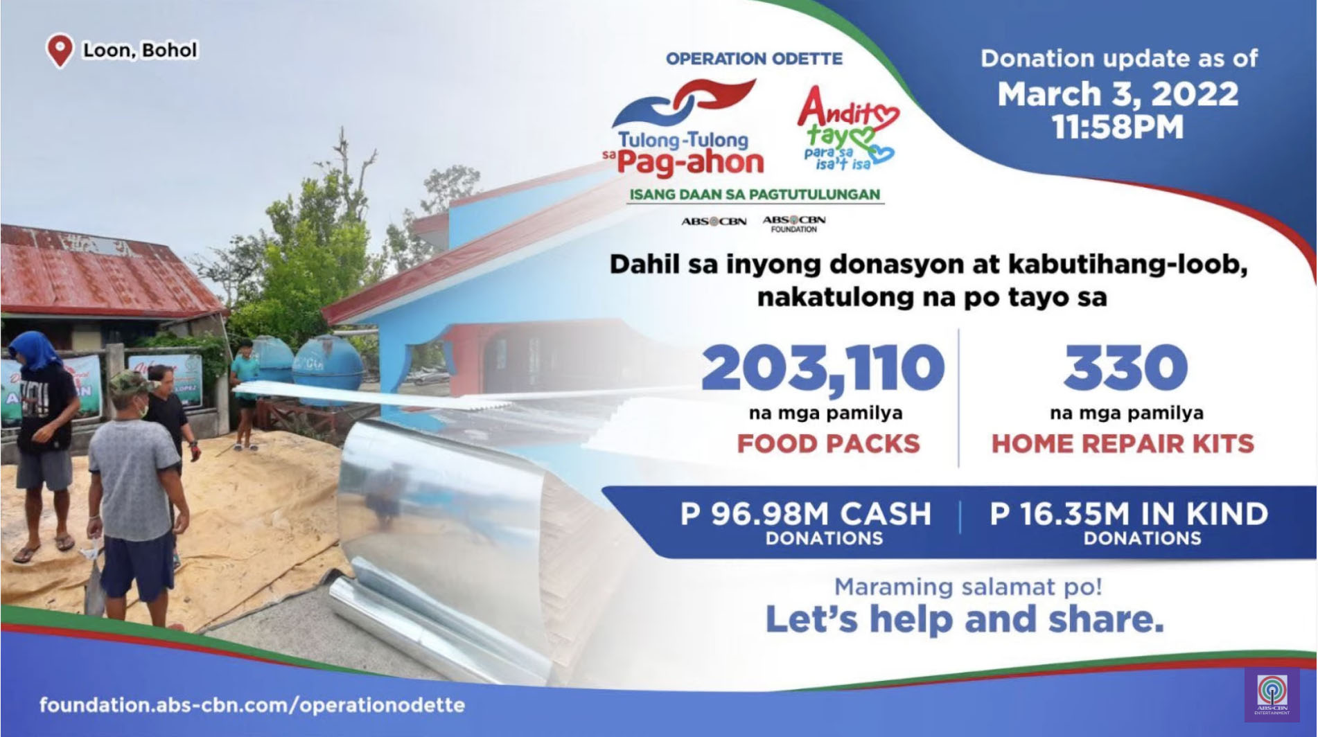 As of March 3, a total of 203,110 families have received food packs and 330 families have been given home repair kits courtesy of the ABS-CBN Foundation and its partners and donors. Overall, the ongoing campaign has raised P96.98 million in cash donations and P16.35 million in-kind donations consisting of rice, canned goods, hygiene kits, and blankets.