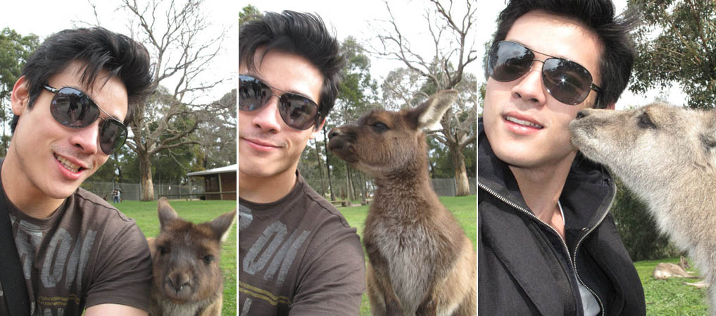 Maybe it’s only fitting that we start with Xian Lim. After all, he’s winning our hottest chinito poll this week, so we’re guessing that by putting his pics here first, we can make this blog post popular, too. Lol. In these photos, he’s seen canoodling with a wallaby during a trip to Melbourne, Australia. We know it isn’t actually his pet, but hey, this is our first Cute Friday post, right? Some folks over at Facebook referred to the animal as a kangaroo, but we seriously doubt that it is. It’s kinda small and plump for a roo. Either way, she’s lucky to have been able to kiss Xian on the cheek 🙂