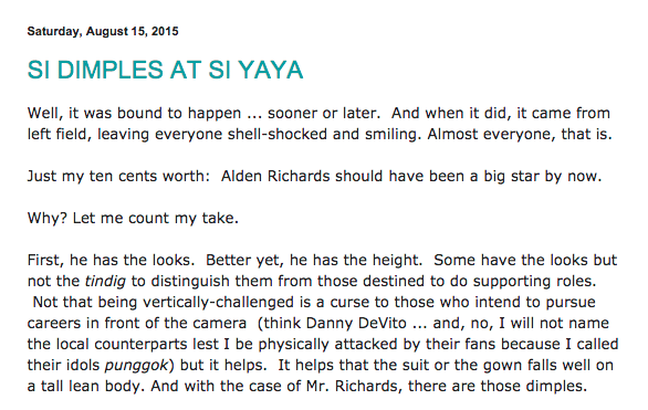 After posting a positive and in-depth analysis of the AlDub phenomenon on his blog Choking On My Adobo, Director Joey Reyes commended Eat Bulaga host (a.k.a. Bae ng Bayan) Alden Richards for personally sending him a text message of thanks for the article. The film director, who is one of the most respected influencers in the industry, said he was able to prove that Alden was a cut above the rest. 🙂