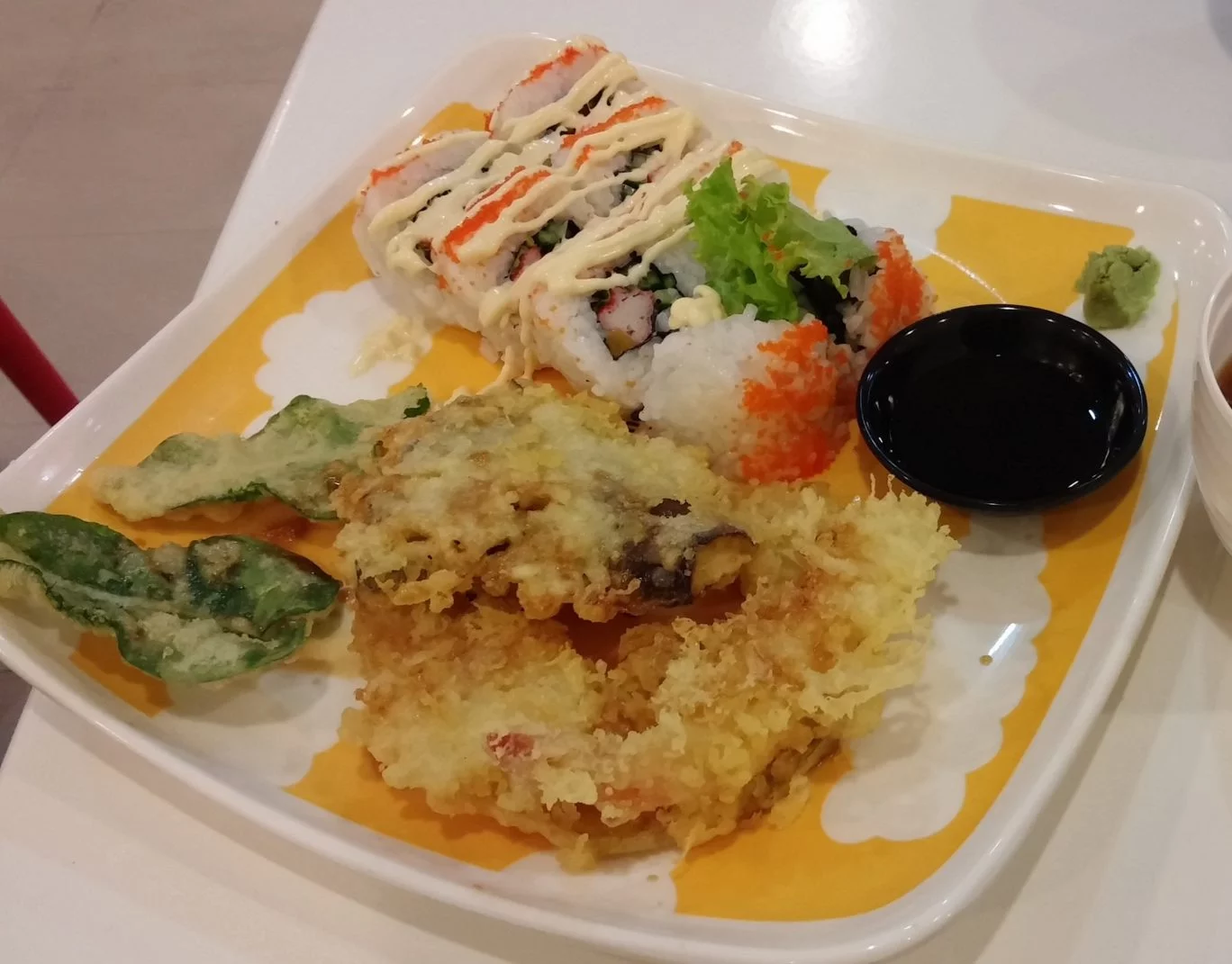 This platter consists of a substantial serving of California maki and a variety of tempuras. For a fast food place, their tempura dishes were quite good. The two pieces of shrimp tempura were rightly seasoned and rather large in size; the kangkong tempuras were crispy and fun to eat; the kamote tempuras were sweet and very delicious; but the eggplant tempuras were just so-so (we wish there was none of this and more of the sweet potato or the kangkong instead). Their tempura sauce was also worth mentioning. We never expected it to be tasty and aromatic especially since they weren’t skimpy with it. The California makis however were a disappointment. They could have been quite tasty if they weren’t “overdressed” with mayo. Also, they weren’t rolled tight enough and the choice of rice wasn’t that sticky, so handling them was a quite a challenge.