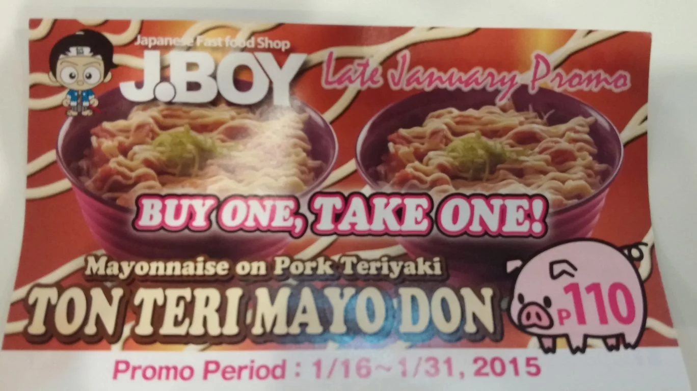 We came across this restaurant about three months ago. It was a Sunday morning, we had just finished shopping at the nearby Farmer’s Wet Market, and we were famished. The first food establishment we saw (Tapa King) was full, so we took a detour and checked out this spacious and clean-looking Japanese fast food that calls itself J.BOY. We entered the place without too much expectation. But ever since that Sunday morning, we have frequented the place too many times that just a few days ago, we found ourselves eating their food not just once, but twice in one day – take out for lunch and dine-in for dinner. 🙂