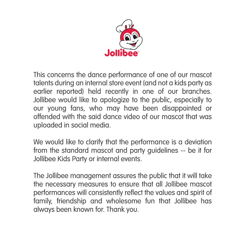 Jollibee’s official statement says the company is apologizing to anyone who may have been offended by the video and explained that the performance is a deviation from the standard mascot and party guidelines they have. The fast food chain also reassured its customers that they will take necessary measures to ensure that all Jollibee mascot performances will reflect the values they uphold and the wholesome fun they promote.