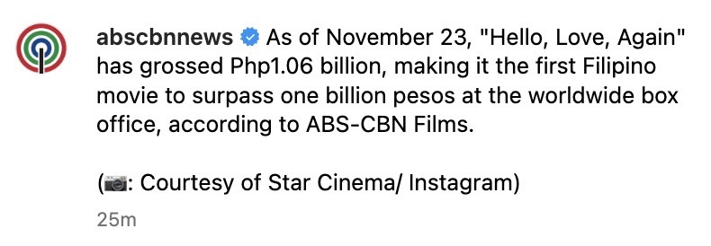 Just days after claiming the title of highest-grossing Filipino film of all time, “Hello, Love, Again” has achieved another monumental feat. ABS-CBN News reported via Instagram that the Kathryn Bernardo and Alden Richards starrer has now grossed ₱1.06 billion in worldwide box office revenue as of November 23, according to ABS-CBN Films. This makes it the first Filipino film ever to break the ₱1 billion mark, solidifying its place in Philippine cinema history.