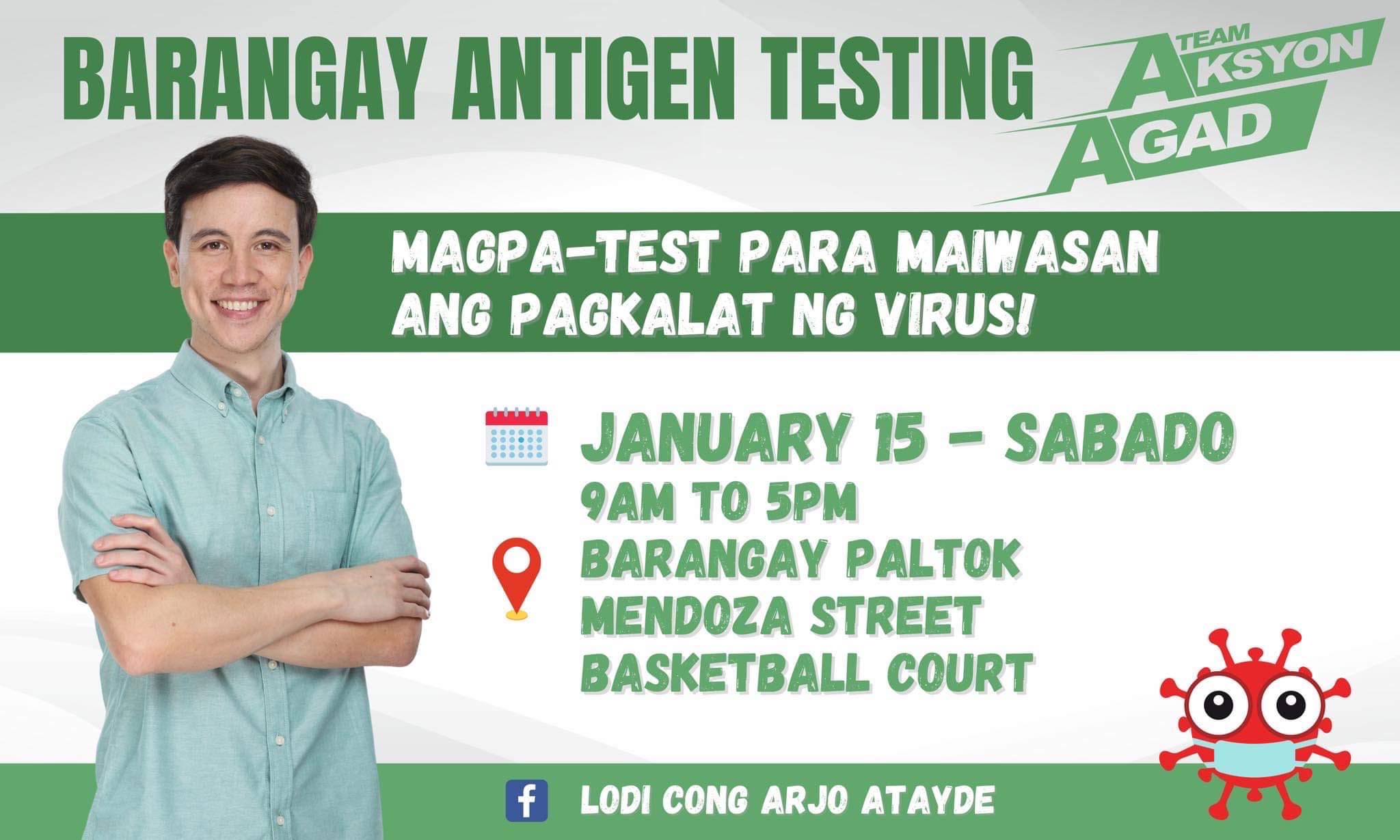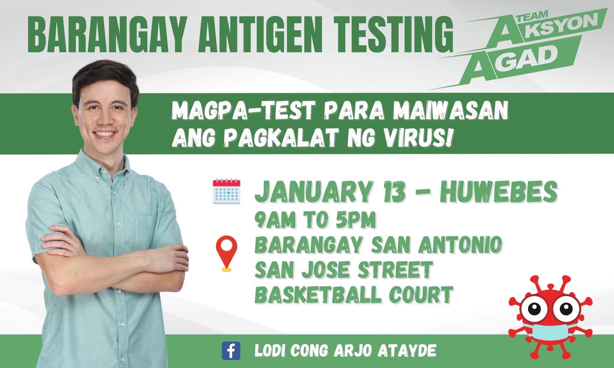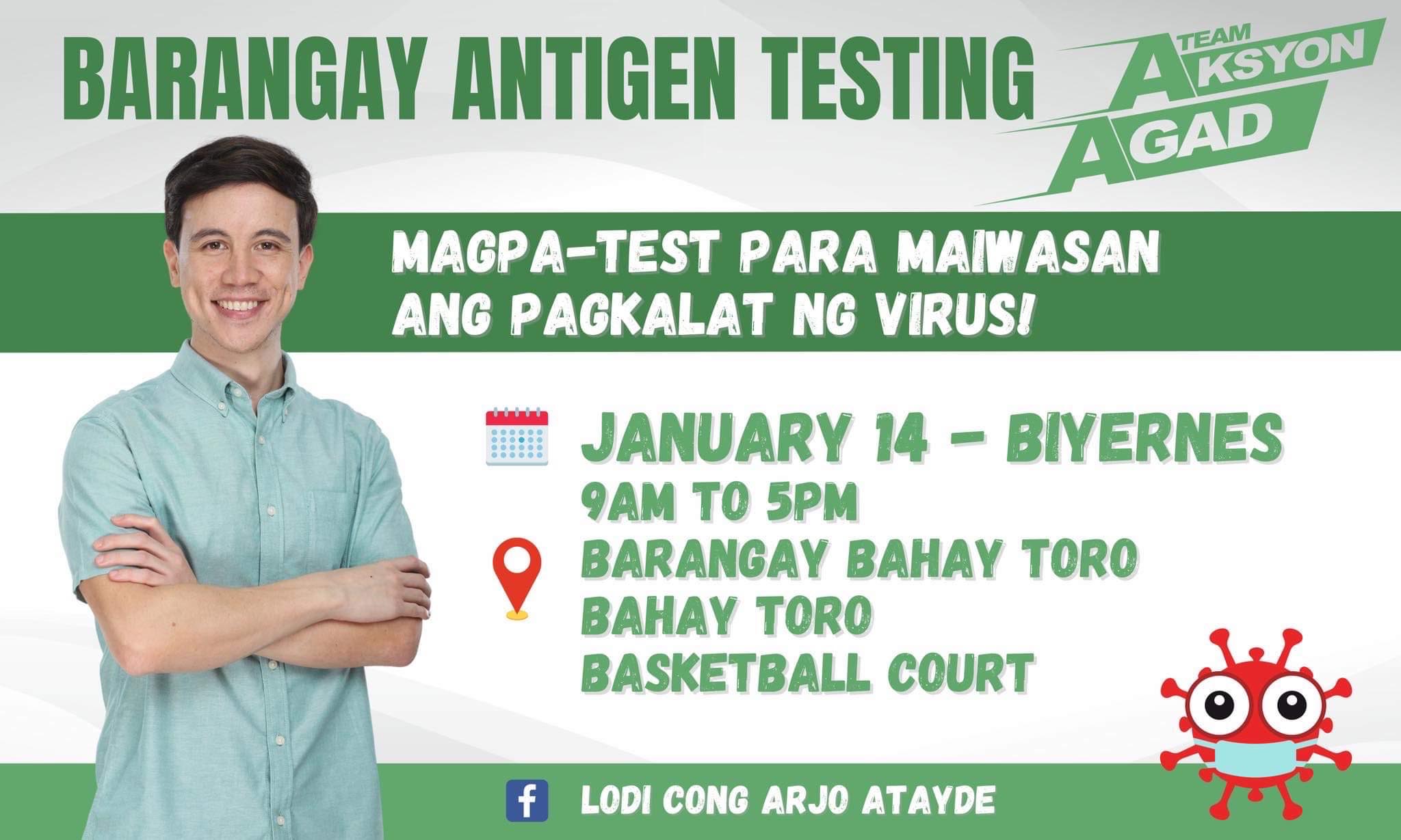 Quick to respond to the surging cases of Covid19 in the country at the start of 2022, internationally acclaimed dramatic actor Arjo Atayde, who is currently running as Congressman of Quezon City’s First District, has activated a massive free Barangay Antigen testing on January 13 from 9:00 a.m. to 5:00 p.m. at Barangay San Antonio, San Jose Street Basketball Court; January 14 from 9:00 a.m. to 5:00 p.m. at Barangay Bahay Toro, Bahay Toro Basketball Court; and on January 15 from 9:00 a.m. to 5:00 p.m. at Barangay Paltok, Mendoza Street Basketball Court.