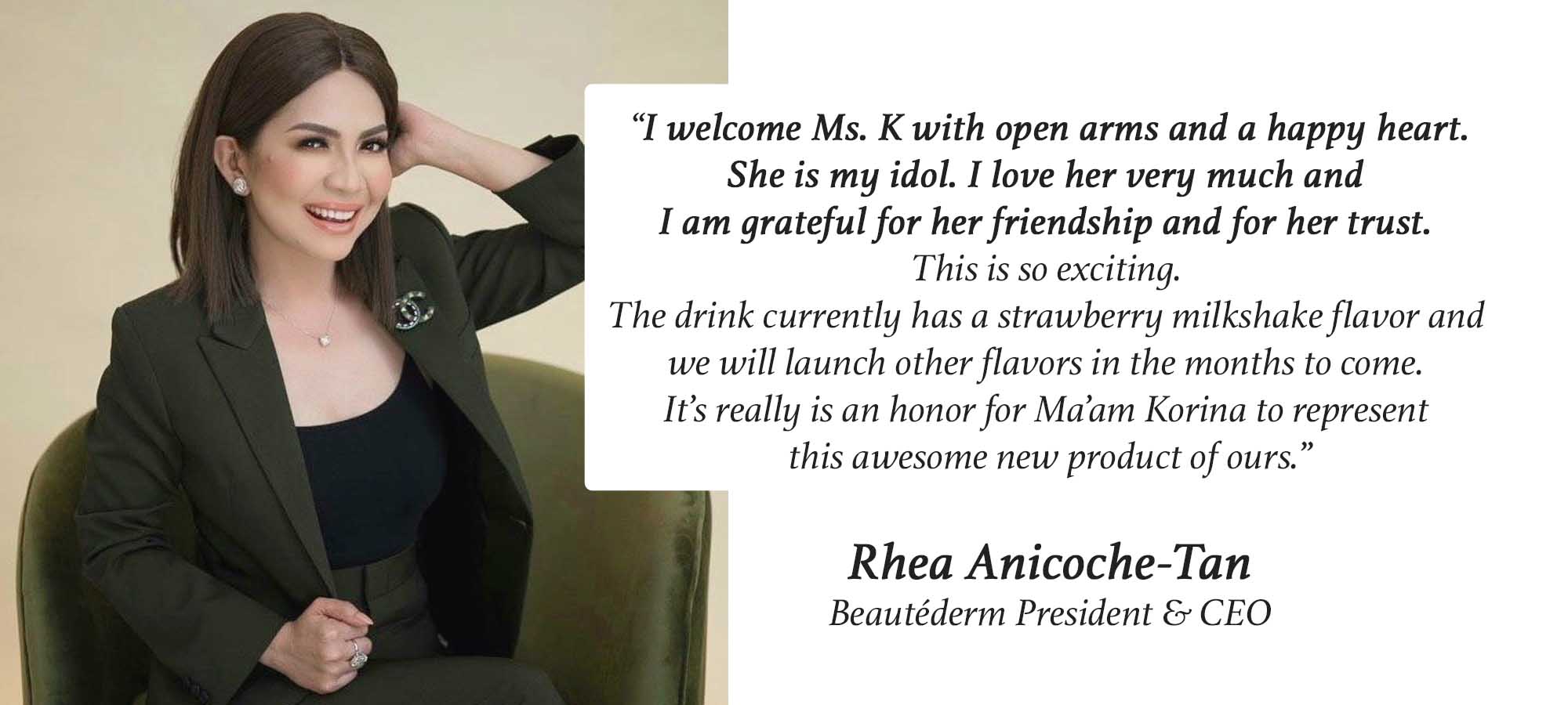 Beautéderm President and CEO Rhea Anicoche-Tan is thrilled to have Korina on board the Beautéderm family. “I welcome Ms. K with open arms and a happy heart,” says Anicoche-Tan. “She is my idol. I love her very much and I am grateful for her friendship and for her trust. This is so exciting. The drink currently has a strawberry milkshake flavor and we will launch other flavors in the months to come. It’s really is an honor for Ma’am Korina to represent this awesome new product of ours.”