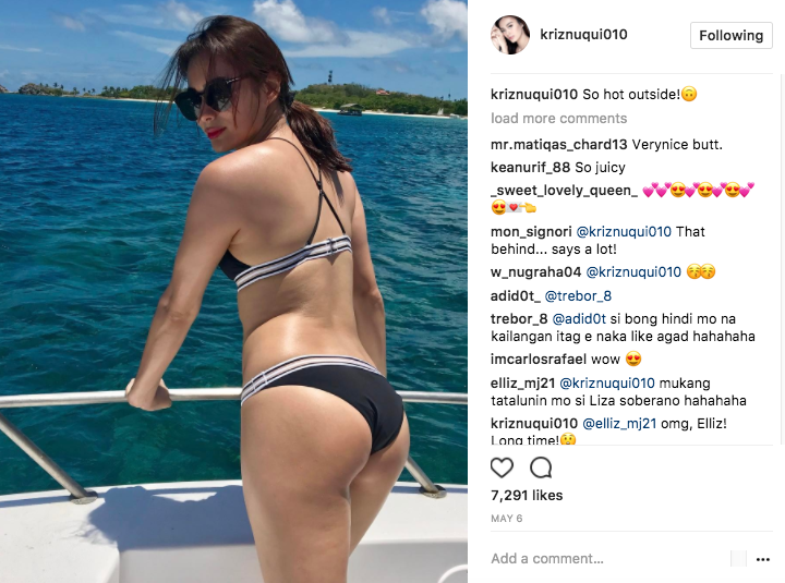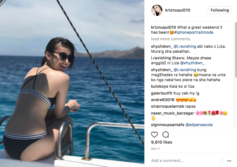 I saw photos of a pretty girl in bikini shared by a LizQuen (Liza Soberano + Enrique Gil) fan and immediately thought it was Liza Soberano donning the sexy swimwear. What a surprise, I thought, since we often see her just in jeans and summer dresses. I noticed that LizQuen fans shared the same reaction based on their comments. Looks like we all thought she’s joining the list of celebrities with trending beach photos. Before writing the story, I found out that the girl in the photo isn’t Liza but commercial model and host Kriz Nuqui. Kriz is a dead ringer for the Kapamilya actress and they could pass off as twins when wearing sunnies (probably because of their similar face shape and smile). When her sunglasses are off, Kriz looks a lot different from Liza, but very pretty nonetheless.