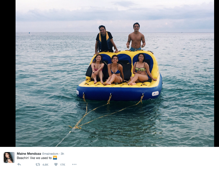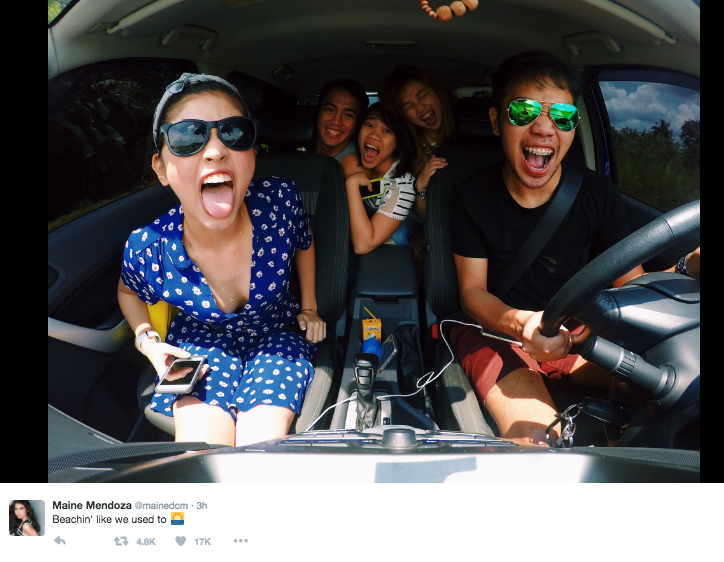 Eat Bulaga’s golden girl (and 1/2 of AlDub) Maine Mendoza is known to have a very packed schedule as a sought-after celebrity so it’s refreshing to see photos of her on the beach with her college friends. On Snapchat and Instagram, Maine posted photos from her weekend getaway and even placed short poems as photo captions. Without her saying, it does look like she wrote the poems herself.
