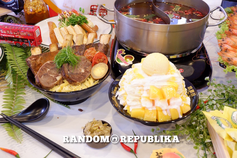 Spot these food items: beef spare ribs noodle soup, Taiwan mango cake, mango jelly, fried chicken breast, pineapple cake, nougat cracker, milk tea with tapioca pearls, Mala spicy hot pot, crunchy chicken pasta, black tea with berry and lychee syrup