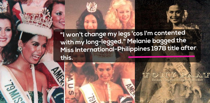 1. (Eddie Mercado: “Angie Dickson has insured her legs for a million dollars, would you also do the same?”) Melanie replies, “I won’t change my legs ‘cos I’m contented with my long-legged.” Melanie bagged the Miss International-Philippines 1978 title after this.