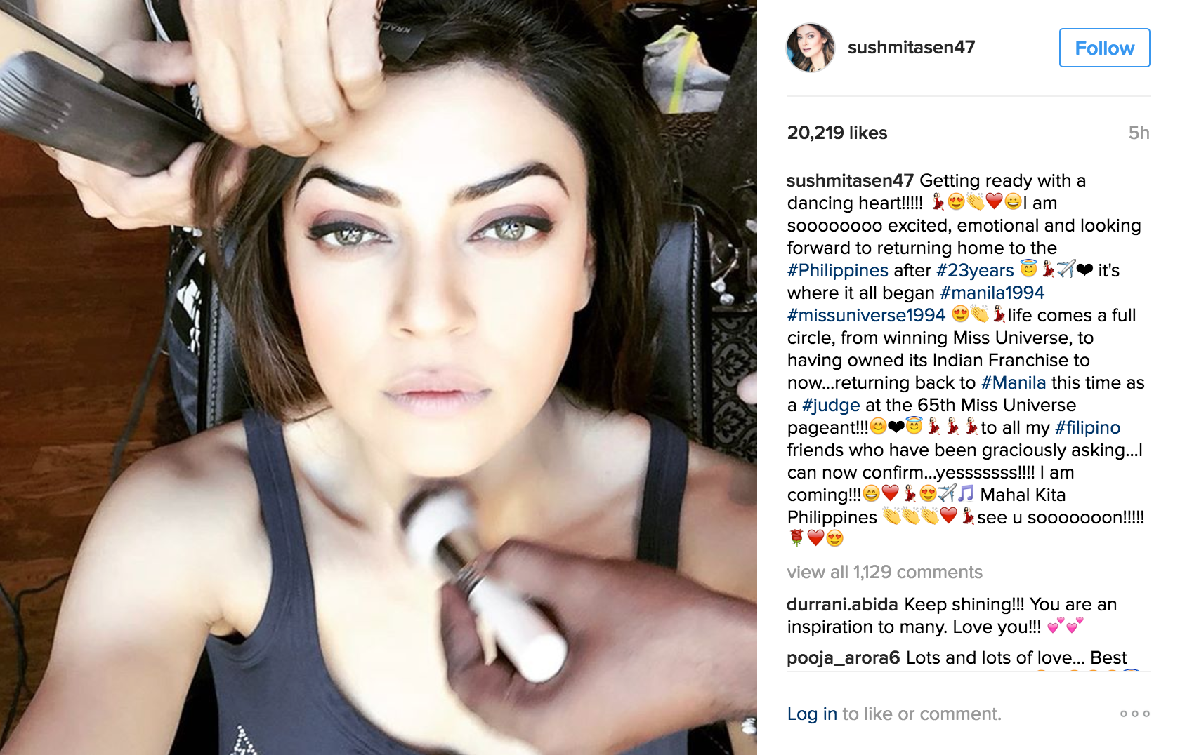 Getting ready with a dancing heart!!!!! ????❤️?I am soooooooo excited, emotional and looking forward to returning home to the#Philippines after #23years???✈️❤ it’s where it all began #manila1994#missuniverse1994????life comes a full circle, from winning Miss Universe, to having owned its Indian Franchise to now…returning back to #Manila this time as a #judge at the 65th Miss Universe pageant!!!?❤???????to all my #filipinofriends who have been graciously asking…I can now confirm…yesssssss!!!! I am coming!!!?❤️???✈️? Mahal Kita Philippines ???❤️??see u sooooooon!!!!!?❤️?
