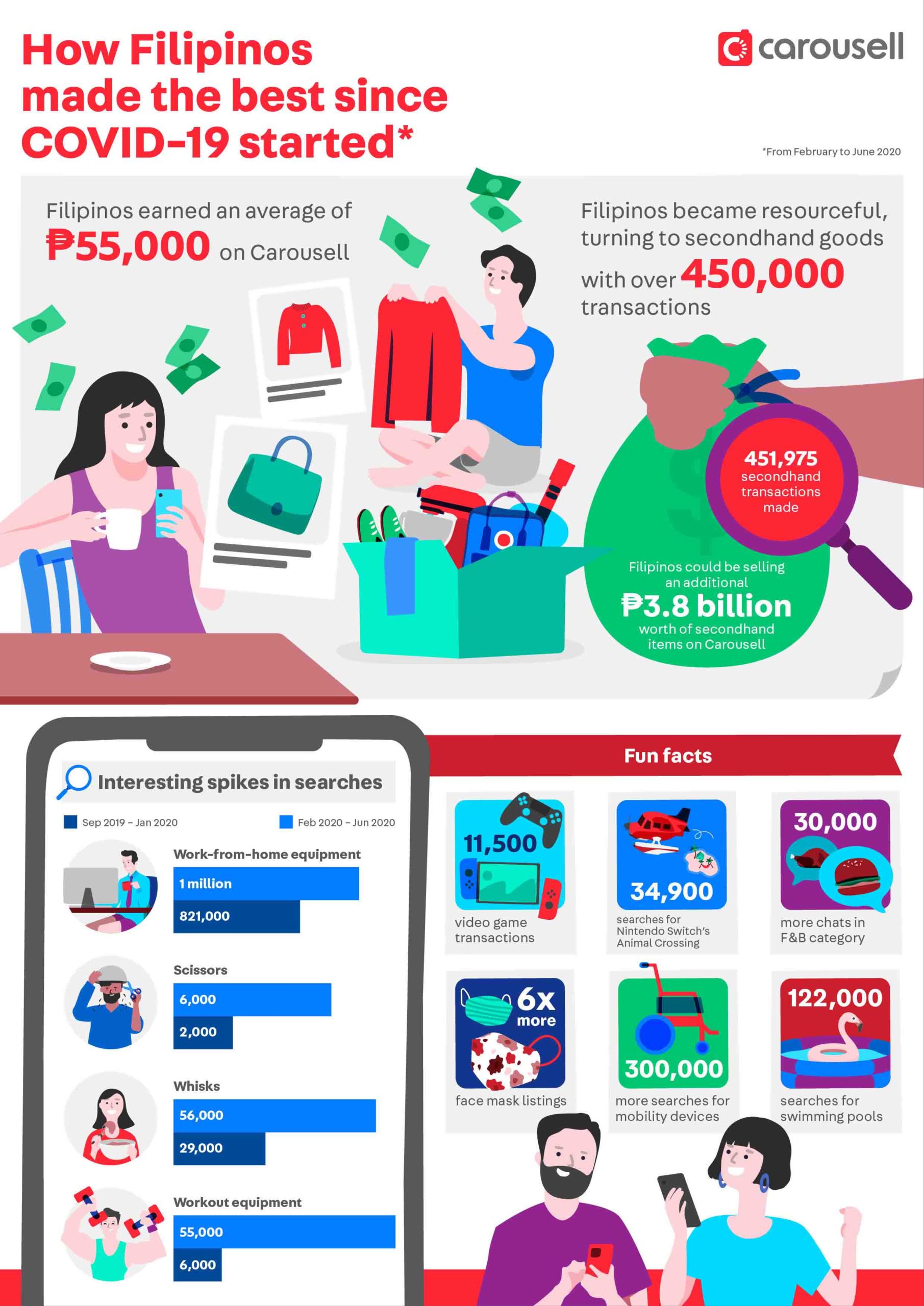 Filipinos made more than 450,000 transactions for second hand items to earn extra money. For many, this was to save for rainy days, supplement income, or even to cushion the blow of losing a job during the pandemic. Carousell user Jhocen, who was forced to pause her full-time work and sold her preloved and vintage items on Carousell to keep her afloat, earned over ₱10,000 on Carousell during quarantine.