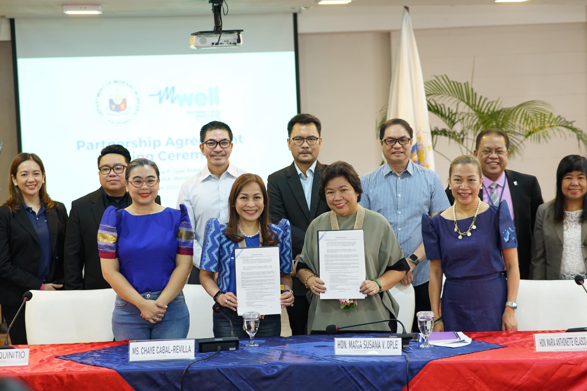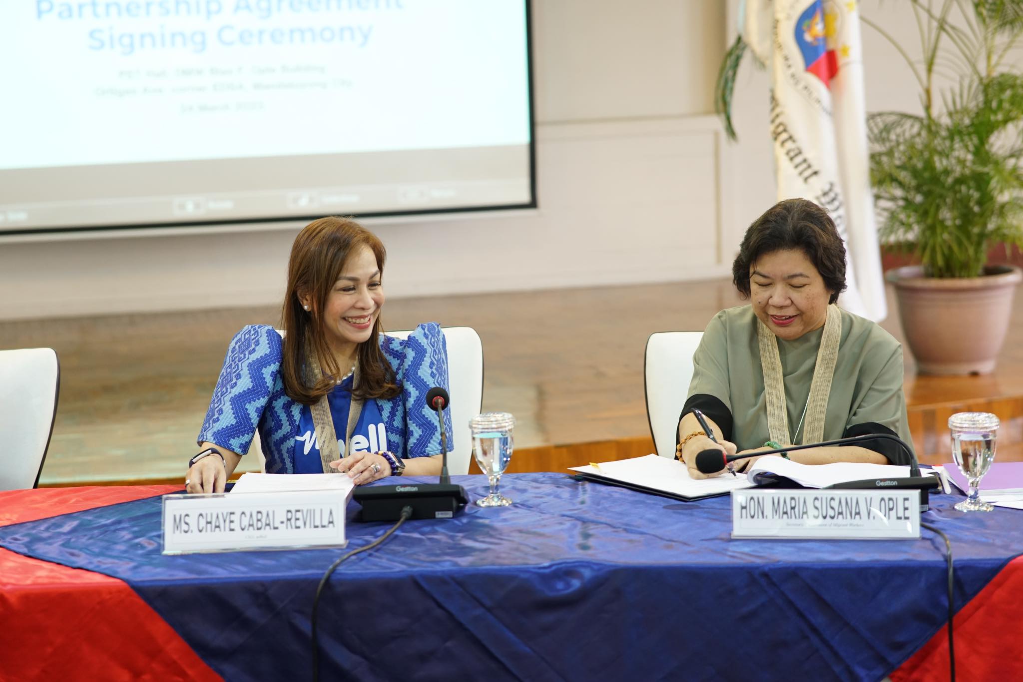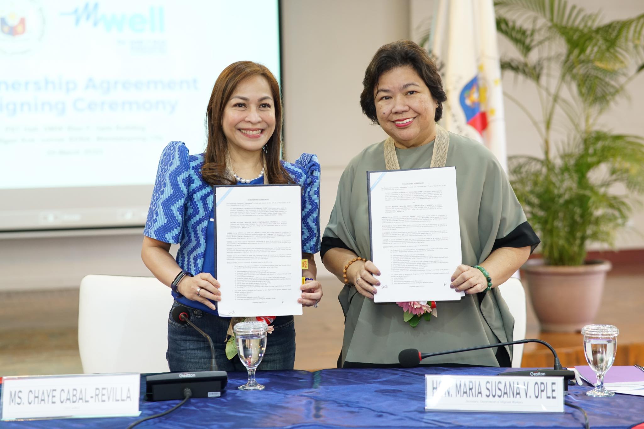 mWell President and CEO and MPIC Chief Finance, Risk and Sustainability Officer Chaye Cabal-Revilla and Department of Migrant Workers Secretary Susan Ople sign the Partnership Agreement to deliver the best possible healthcare services to OFWs and their families through the mWell app.