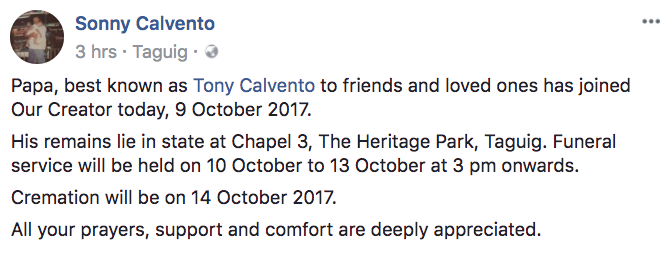 It is sad to know that Mr. Calvento passed away yesterday, October 9. According to the news report this morning, he died due to multiple organ failure. His son posted this on Facebook: