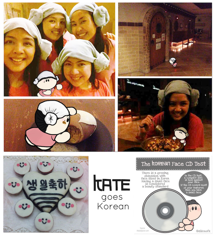 That’s my 2014 self with my friends and sister wearing our Jjimjilbang (Korean spa) head towels at the spa. K loved the Korean grilled egg and pat bing su (Korean halo-halo). — There’s the cake I baked and decorated in 2011 for my bestfriend which says 생일 축하 (saeng-il chugha), Happy Birthday in Korean. — The last photo is one of my many K drawings posted on my Instagram art account @sliceofk. I turned a Korean concept into an artwork.