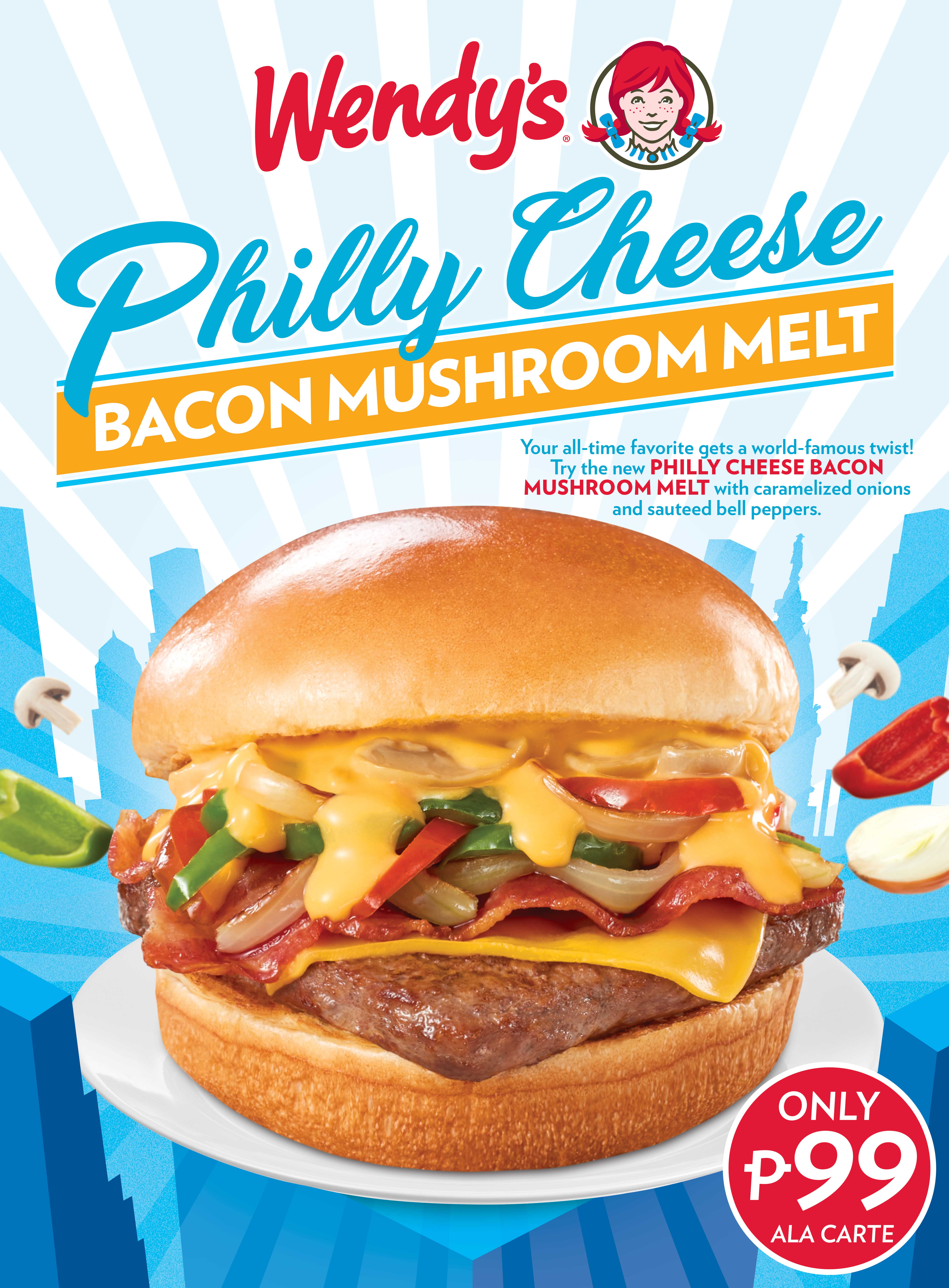Wendy’s Philly Cheese Bacon Mushroom Melt. All-time classic and Wendy’s bestselling Bacon Mushroom Melt gets transformed. Taking the two key ingredients of Philadelphia’s famed Philly Cheesesteak sandwich – crunchy sautéed bell peppers and caramelized onions – and mixing them with mushroom cheddar sauce, crispy bacon strips, and 100% pure beef patty.