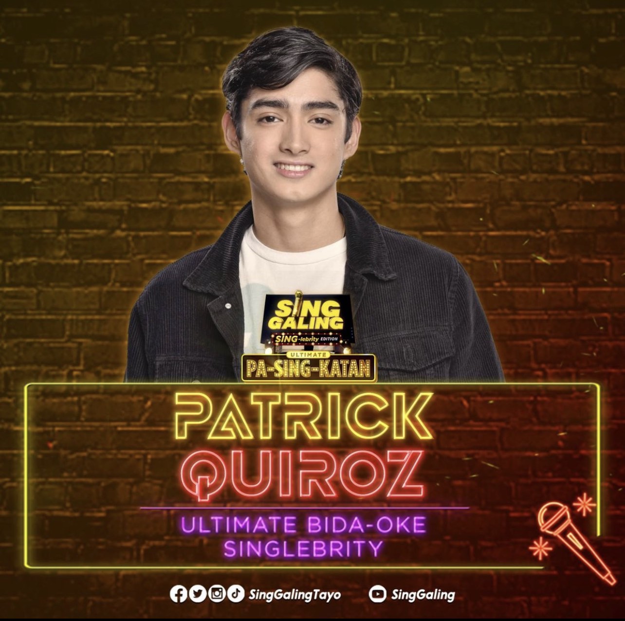 Singer-actor Patrick Quiroz was named the first ever Ultimate Bidaoke Singlebrity of the Ultimate Pa-SING-katan of videoke game show Sing Galing’s Sing-lebrity edition. The finals night was held last March 5, 2022 at the historic Manila Metropolitan Theater. Patrick won a P1 million cash prize while his chosen Bida-ficiary won P100,000. He won the title by garnering more than 60% of the fan votes after his duet battle with Aljur Abrenica.