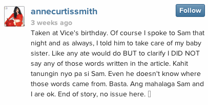 Without spilling details, Sam Concepcion admits in an interview with Boy Abunda on Buzz Ng Bayan that a confrontation between him and his girlfriend Jasmine Curtis‘ older sister Anne Curtis did take place. A few weeks ago, the news circulated online that a teary-eyed and angered Sam left comedian Vice Ganda’s birthday party at 71 Gramercy because of the rumored confrontation. Through Instagram, Anne was quick to deny that the alleged harsh words claimed in an article (“Why are you here? Who invited you? You’re not classy enough to be here!”) were said to Sam. She clarified that she just reminded Sam to take care of her younger sister.