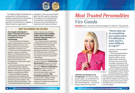 The Trusted Brands survey, conducted independently by Catalyst, a leading research company, gathered feedback from 8,000 consumers across the markets of the Philippines, Singapore, Malaysia, Hong Kong, and Taiwan. Respondents were asked to identify the brands of products and services they trust the most. The complete list of winners can be found exclusively in the April 2023 issue of Reader’s Digest magazine in the Philippines.