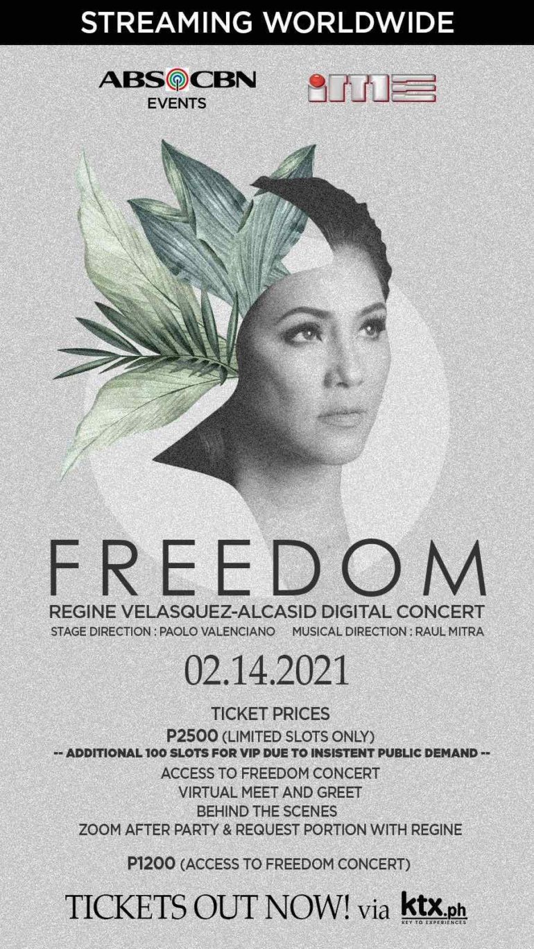 Celebrate Valentine’s Day with music and love in Regine’s “Freedom” digital concert happening on February 14 (Sunday). Book your tickets now at KTX.ph. For more details, check out KTX.ph on Facebook (www.facebook.com/ktxtickets), Twitter (@KtxPH), and Instagram (ktx.ph).