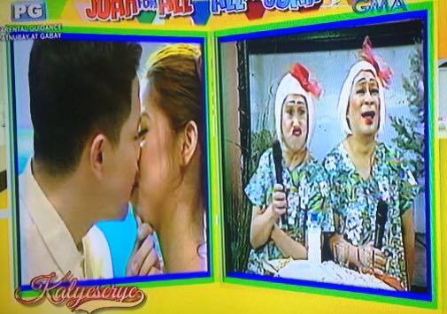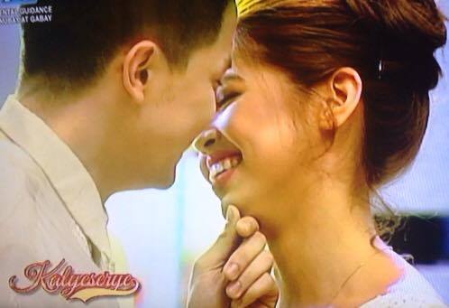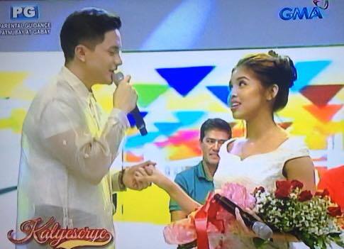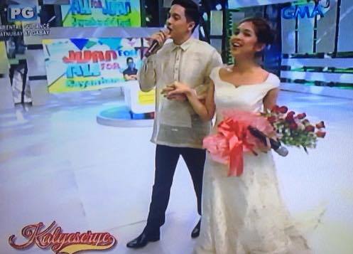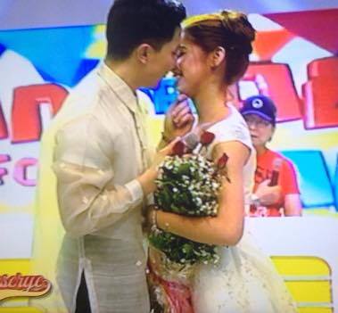 Fans went wild in the studio as Alden Richards and “Yaya Dub” Maine Mendoza appeared donning wedding outfits for their 32nd weeksary celebration. Disguised as a pretend fashion show, the celebration became memorable as Alden serenaded Yaya Dub with their theme song “God Gave Me You” and before the segment, it looks like the much-requested pretend wedding kiss happened. Did his lips touch hers? You be the judge.