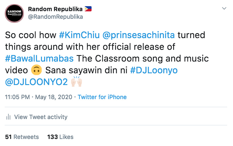 Kapamilya actress Kim Chiu is back in the scene after putting a positive spin to her viral speech blunder during the Laban Kapamilya online protest. The “Bawal Lumabas” speech that spawned numerous memes and dance videos now has song and music video versions. The official uploads in different social media platforms easily accumulated more than 10 million views in just 24 hours.