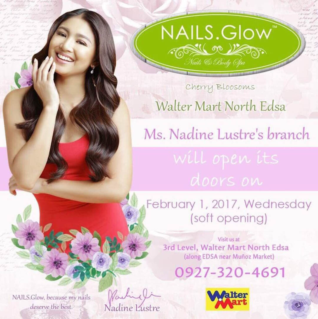 Last November, we had the chance to witness the unveiling of Kapamilya actress and 1/2 of JaDine Nadine Lustre‘s newest brand ambassadorship and business venture with Nails.Glow. Nails.Glow is a nail and spa service business owned by husband and wife Ferdie and AJ Opeña. Earlier today, Nadine revealed on Twitter that her first branch at the 3rd Level of Waltermart North EDSA (along EDSA near Muñoz Market) is now on soft opening.