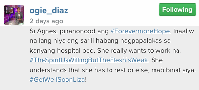 Many of us are wondering why we’re not seeing Liza Soberano, better known as Agnes, since this Monday’s episode of primetime hit, Forevermore. The leadstar’s manager Ogie Diaz revealed in his Instagram post that the young actress is currently suffering from overfatigue and flu and confined in a hospital for recovery. Ogie shared that Liza is so eager to go back to work but understands that she needs to fully recover first. Aww, get well soon, Liza. Xagnes and LizQuen fans are surely eager to see you as well! 🙂